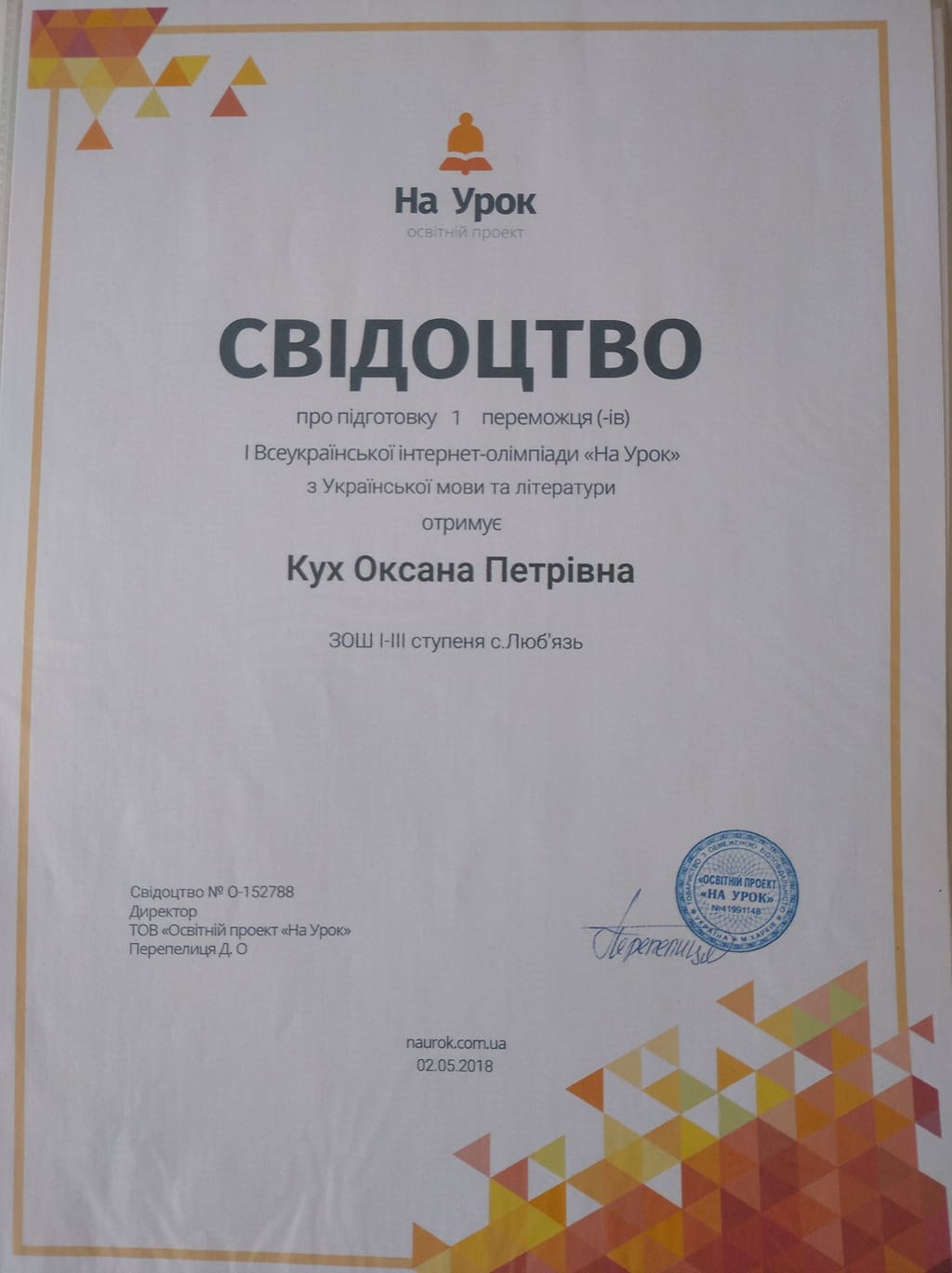 2018-2020 рр. - дипломи І-ІІІ ст. та сертифікати в онлайн-конкурсах від проектів "Всеосвіта", "На Урок":